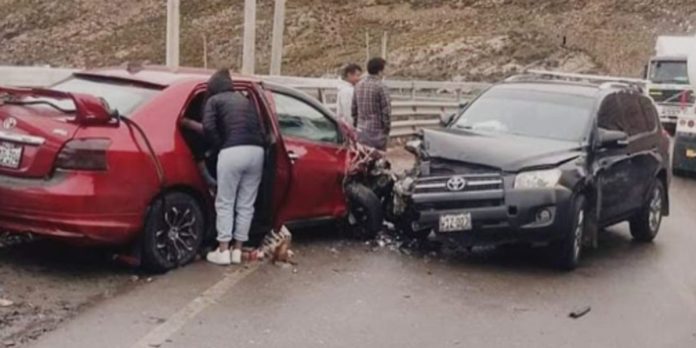 Un aparatoso accidente ocurrió en el km. 132.700 de la carretera central, donde un auto Toyota Yaris rojo y una camioneta Toyota Rav 4 negra colisionaron frontalmente. El choque dejó a cuatro personas heridas que se dirigían de Lima hacia Huancayo.