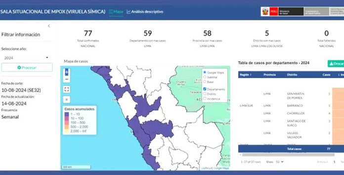 Hasta agosto de este año, se han registrado 77 casos de viruela del mono en Perú, siendo Lima la región más afectada con el 66,7 % de los casos, seguida por Callao, Huánuco, La Libertad y Piura.
