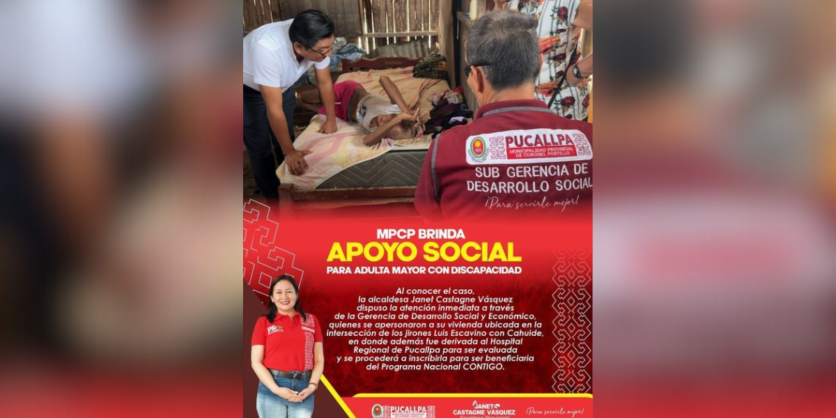 Personal de la subgerencia de Desarrollo Social de la municipalidad provincial de Coronel Portillo, alertado por la alcaldesa, se movilizó hasta la intersección de los jirones Luis Scavino con Cahuide para ocuparse de la situación de una adulta mayor con discapacidad y en estado de abandono, debido a los escasos recursos de sus familiares.