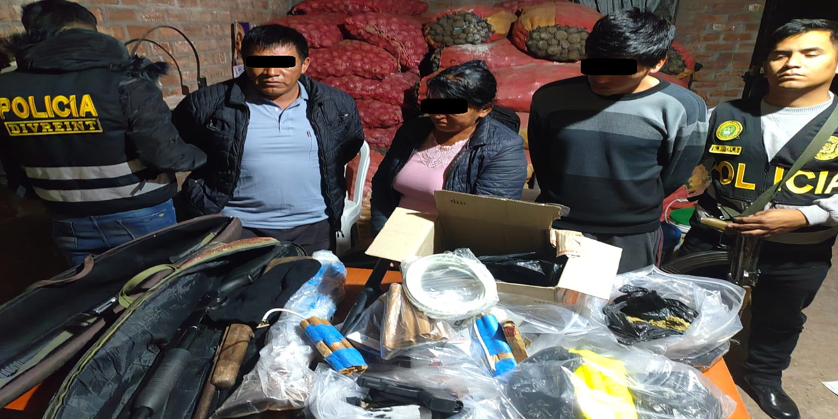 Los custodios del orden allanaron un inmueble donde intervinieron a Hugo Ayala Licas (43), María Luz Medina Gómez (52) y Juan Daniel Medina Gómez (27). Durante el registro domiciliario, se encontraron tres paquetes rectangulares tipo ladrillo, al parecer clorhidrato de cocaína, con un peso de dos kilos, así como 400 gramos de marihuana. Además, se incautaron cinco escopetas, dos escopetas hechizas, dos pistolas, 15 cartuchos de dinamita, dos rollos de mecha lenta, fulminantes, una cacerina abastecida con 15 municiones y un vehículo con placa de rodaje 74287Y con requisitoria vigente, entre otros objetos.