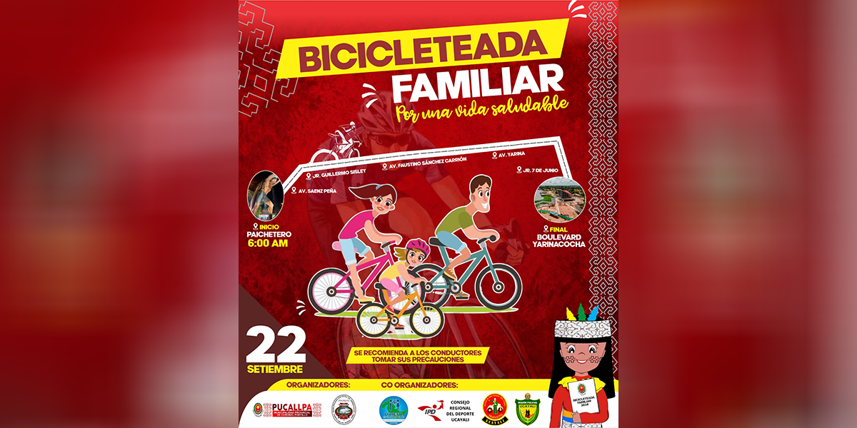 La bicicleteada familiar está prevista para el domingo 22 de septiembre de 2024. La actividad comenzará a las 06:00 am desde el Monumento al Paichetero y seguirá una ruta que incluye la Av. Saénz Peña, Jr. Guillermo Sisley, Jr. José F. Sánchez Carrión, Av. Yarinacocha y Jr. 7 de Junio, con la llegada programada en el Boulevard de Yarinacocha.