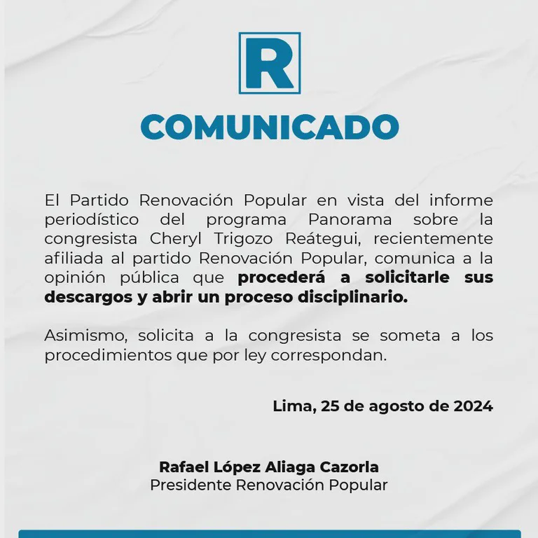 Tras la difusión del caso, Renovación Popular anunció la apertura de un proceso disciplinario contra Trigozo y solicitará sus descargos. La congresista se unió a este partido recientemente, luego de dejar Alianza para el Progreso (APP), agrupación con la que fue elegida en las elecciones de 2021.