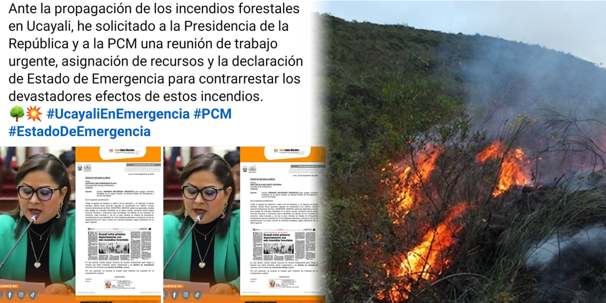 Como consecuencia de la publicación del diario Ímpetu, del día jueves 12 pasado, sobre las más de 10 mil hectáreas arrasadas por los incendios forestales y que la región Ucayali se encuentra entre los departamentos con más incendios en su territorio, la congresista Jeny López Morales, envió documentos a la Presidencia de la República y a la PCM para solicitar una reunión de trabajo a fin de abordar la posibilidad de que se declare en Estado de Emergencia a Ucayali y otras regiones amazónicas afectadas por estos incendios forestales y también solicitó asignar recursos humanos y financieros para contrarrestar estos efectos.