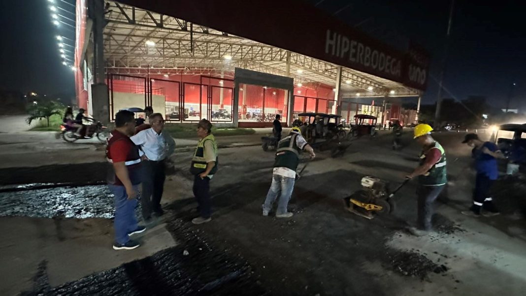 Personal de la municipalidad provincial de Coronel Portillo, aprovecha las horas de la noche, cuando hay menos tránsito vehicular, para efectuar el parchado de los tramos críticos de la avenida Salvador Allende, en el tramo entre la avenida Centenario y avenida Unión.