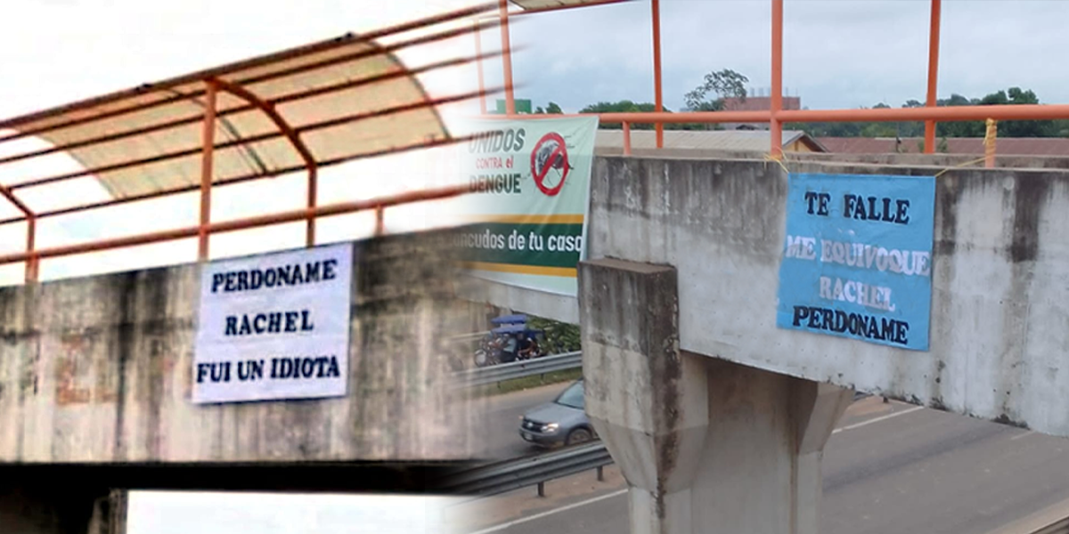 Usuarios reportaron un curioso evento: varios carteles fueron colgados en más de un puente de la Carretera Federico Basadre (CFB). Según se logra ver en las imágenes, los carteles llevan escritas frases como «Perdóname, Rachel, fui un idiota» y «Te fallé, me equivoqué, Rachel, perdóname».