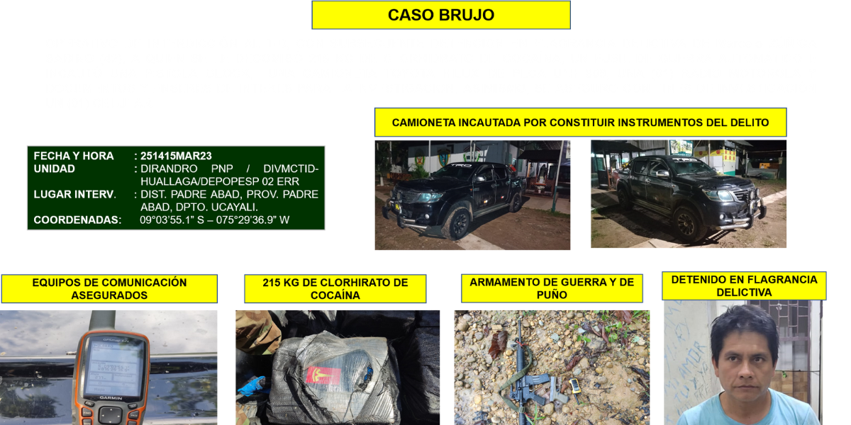 Personal policial de la Dirección Antidrogas Huallaga en un trabajo de interdicción al tráfico ilícito de drogas en el distrito y provincia de Padre Abad, región Ucayali, realizado los días 24, 25 y 26 de marzo de 2023, incautó más de 200 kilos de clorhidrato de cocaína, además de armas de fuego abastecidas, un equipo de radio comunicación y la camioneta en la cual era transportada la droga. El conductor de la camioneta, Marcelo Zúñiga Sabino, fue detenido, mientras que dos personas que oficiaban de seguridad del cargamento huyeron aprovechando la espesura del monte. Los sujetos dejaron en el interior del vehículo un fusil automático marca Anderson calibre 5.56 x 45 milímetros, una pistola marca Glock calibre 380 y una radio portátil Motorola.