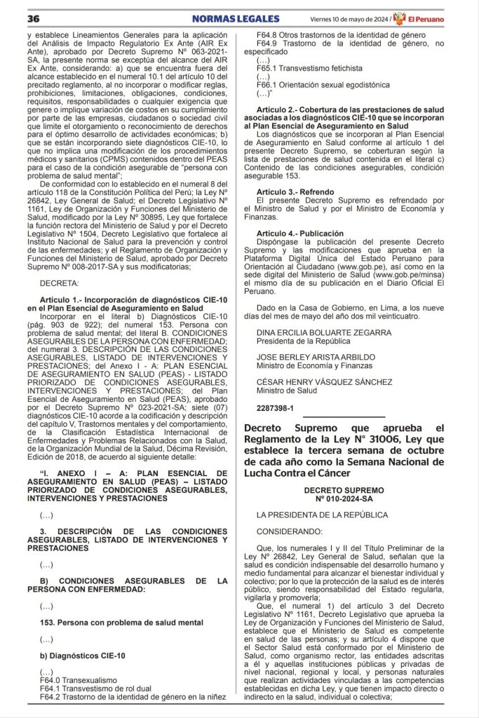 Según el documento oficial publicado en el diario ‘El Peruano’, el Ministerio de Salud ha incorporado la Clasificación Internacional de Enfermedades (CIE-10) de la Organización Mundial de la Salud en el Plan de Aseguramiento en Salud (PEAS), lo que implica que estos diagnósticos ahora sean considerados trastornos mentales asegurados por el servicio estatal de salud.