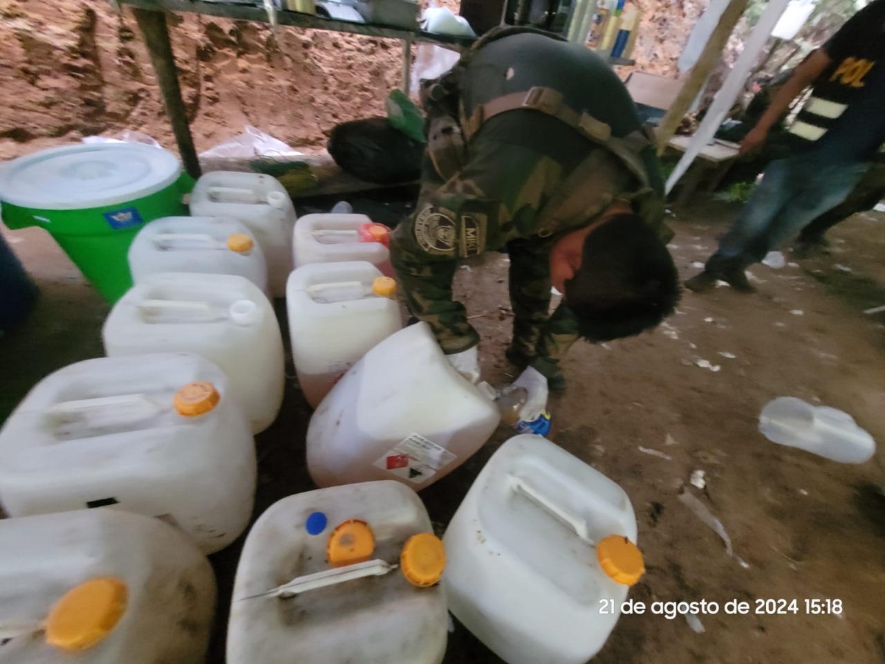 Los agentes, tras un despliegue estratégico en la zona, encontraron el primer laboratorio rudimentario construido con materiales simples como palos y plásticos. En el lugar, se descubrieron 2.232 kilogramos de pasta básica de cocaína, dos armas de fuego artesanales sin número de serie, equipo de comunicación y diversos productos químicos, entre ellos acetona, soda cáustica y combustible.