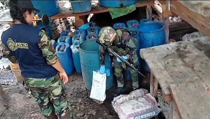 En el interior del laboratorio, se hallaron dos tanques que contenían un total de 2 mil kilos de hoja de coca picada, en proceso de maceración. También se encontraron 4 cilindros y 17 bidones de gasolina, 25 kilos de una sustancia identificada preliminarmente como bisulfato de sodio, bolsas de cemento y otros equipos comúnmente utilizados en la elaboración de drogas. En el exterior del laboratorio, se descubrieron 10 mil kilos de hoja de coca en estado de putrefacción, lo que indica un manejo significativo de materias primas para la producción de cocaína.