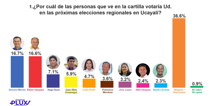 Antonio Marino y Edwin Vásquez, casi empatados, encabezan las preferencias electorales para gobernador regional en la primera encuesta sobre la intención de voto para las próximas elecciones regionales y municipales 2026 que se difundió a través de Ribereña Noticias, en tanto que, en tercer lugar, se ubica Víctor Hugo Sosa.