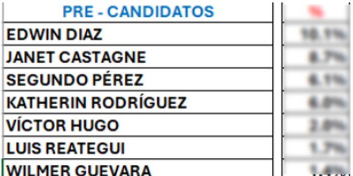 La encuesta presenta un panorama inesperado para muchos ya que, en los dos primeros lugares destacan el excandidato Edwin “Teterita” Díaz Paredes y la actual alcaldesa Janet Castagne Vásquez. Paradójicamente, en las elecciones pasadas, ellos postularon en la misma lista. Edwin Díaz fue excluido, por lo que, al ganar la lista, Castagne tuvo que asumir ese reto.