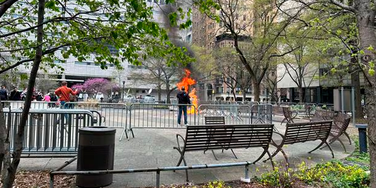 Frente al tribunal de Manhattan, donde se realiza el juicio contra Donald Trump, un individuo prendió fuego a su propio cuerpo, acción que generó una respuesta de emergencia por parte de autoridades y transeúntes. Las imágenes compartidas en redes sociales muestran a personas tratando de apagar las llamas con un extintor, mientras que el cuerpo del individuo, gravemente quemado, fue llevado rápidamente para recibir atención médica. Las autoridades ahora están investigando los motivos detrás de este acto extremo que tuvo lugar en la zona reservada para manifestaciones frente al tribunal.