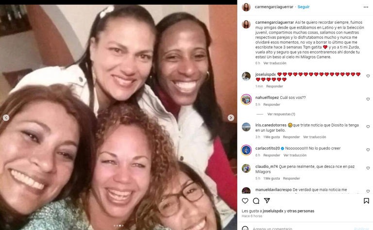 Por su parte, García le dedicó una emotiva publicación en Instagram: “Así te quiero recordar siempre, fuimos muy amigas desde que estábamos en Latino y en la selección juvenil. Compartimos muchas cosas, salíamos con nuestras respectivas parejas y lo disfrutábamos mucho. Nunca olvidaré esos momentos, no voy a borrar lo último que me escribiste hace tres semanas: ‘Te quiero mucho gatita’. Y yo a ti mi ‘Zurda’, vuela alto y seguro que ya nos encontraremos ahí donde tú estás. Un beso al cielo mi Milagros Cámere”.