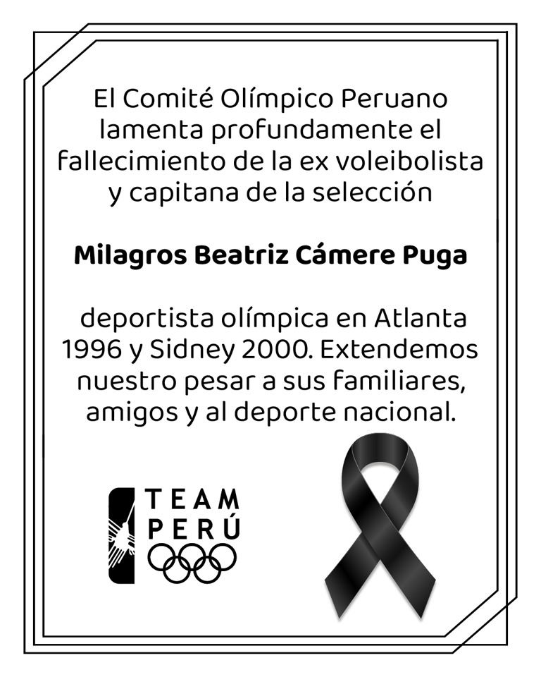 «El IPD lamenta el sensible fallecimiento de la exvoleibolista Milagros Cámere Puga, olímpica en Atlanta 1996 y Sidney 2000, medallista panamericana y campeona sudamericana. Asimismo, expresa sus más sentidas condolencias a su familia en esto momentos de profunda tristeza», publicó la cuenta oficial del organismo.