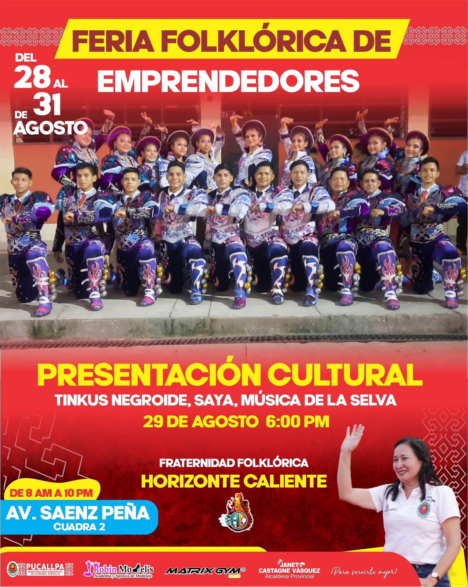 Desde las 8 de la mañana de hoy, hasta el próximo 31 de agosto, en la cuadra 2 de la avenida Sáenz Peña se desarrollará la Primera Feria Folklórica de Emprendedores organizada por la municipalidad provincial de Coronel Portillo. Esta Feria atenderá desde las 8 de la mañana hasta las 10 de la noche y se presentarán una serie de actividades artísticas.