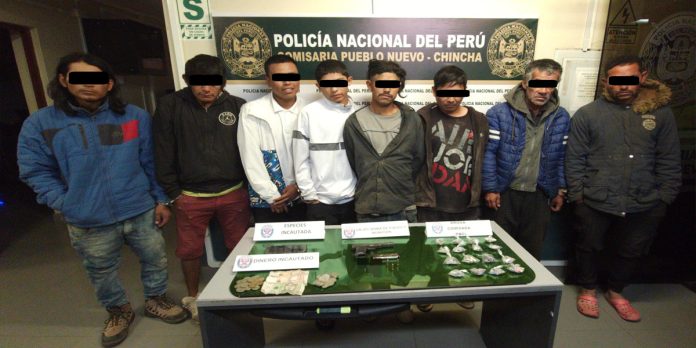 Policías de la comisaría PNP Pueblo Nuevo del Frente Policial Ica intervinieron a ocho personas implicadas en los delitos de tenencia ilegal de armas de fuego y municiones, y tráfico ilícito de drogas. El hecho sucedió en el sector Upis Alejandro Toledo, en el distrito de Chincha Alta, Ica. La intervención se realizó luego de que la policía fuera informada de un grupo de sujetos que realizaban disparos y consumían sustancias ilícitas en la zona.