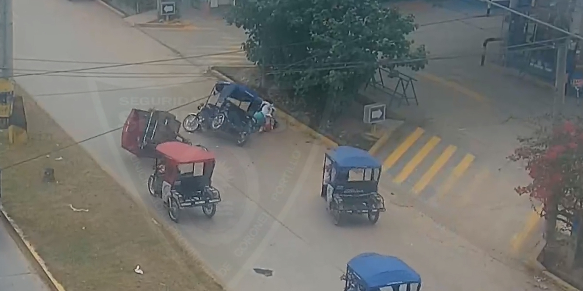 En las imágenes, se observa a varios vehículos esperando la luz verde del semáforo. Al cambiar la señal, los vehículos comienzan a avanzar, pero de repente entra en escena un motocarro rojo a toda velocidad. El conductor del vehículo efectúa maniobras temerarias y choca contra otro trimóvil, el cual, a su vez, colisiona con una motocicleta. El impacto provoca que el conductor de la moto y su pasajera caigan pesadamente al pavimento.