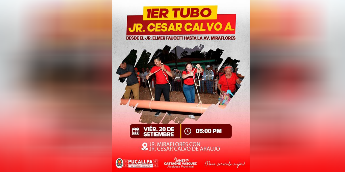 La municipalidad provincial de Coronel Portillo, siguiendo con su programa de mejorar las condiciones de vida de la población, ha establecido que el próximo viernes 20 de setiembre, estarán poniendo el primer tubo de la obra de agua y desagüe del jirón César Calvo de Araujo, en el tramo que va desde el jirón Elmer Faucett hasta la avenida Miraflores.