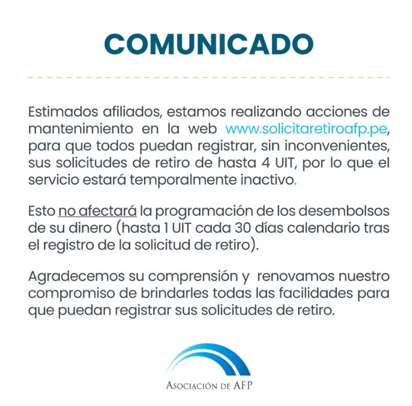 A solo horas de iniciar el proceso de registro para aportantes con el último dígito del DNI como el número 8, la Asociación de AFP emitió un comunicado anunciando la suspensión temporal del servicio, dejando a los usuarios imposibilitados de realizar solicitudes de retiro o consultar el estado de las mismas. Según la institución, esta suspensión se debe a «acciones de mantenimiento» en la página web destinada a este fin: www.solicitaretiroafp.pe.