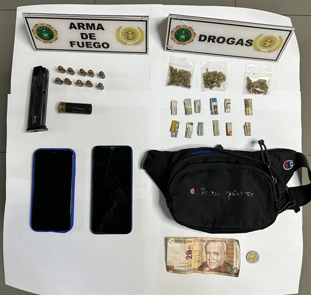 Durante el registro personal, se encontró en posesión de los detenidos un cartucho para escopeta, una cacerina cargada con diez municiones, así como 12 envoltorios de pasta básica de cocaína (PBC), tres bolsas conteniendo Cannabis sativa-marihuana y dos teléfonos celulares. Según información preliminar, se presume que los individuos están vinculados a actividades delictivas relacionadas con asaltos a mano armada.