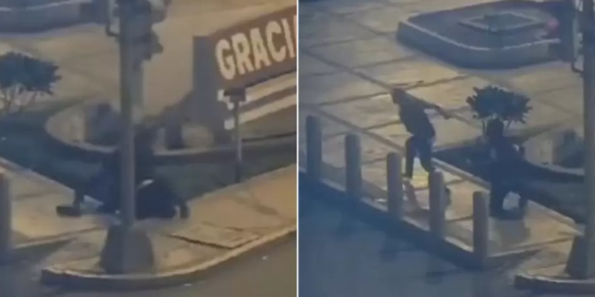 El incidente ocurrió durante la noche en los alrededores del Óvalo 9 de Octubre, donde el agente de seguridad se encontraba llevando a cabo una ronda como parte de su turno de trabajo. Según las imágenes capturadas, el sereno estaba caminando cuando dos individuos lo abordaron sorpresivamente. Uno de los delincuentes intentó derribarlo mientras el otro lo rodeaba, aparentemente para evitar cualquier intento de escape por parte del sereno.