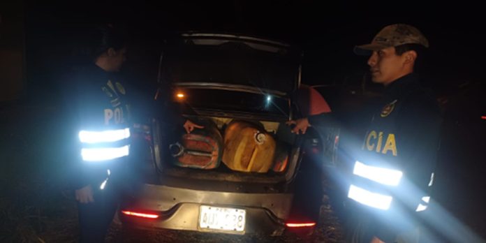 En el lugar, los agentes del orden encontraron estacionado a un lado de la vía un vehículo Kia Rio negro, con placa AUV-088. Al notar la presencia policial, el conductor huyó rápidamente entre la vegetación de la zona. Al registrar el vehículo, se hallaron 15 bidones, cada uno conteniendo combustible diésel, valorizado en el mercado nacional por la suma de S/98 800.00.