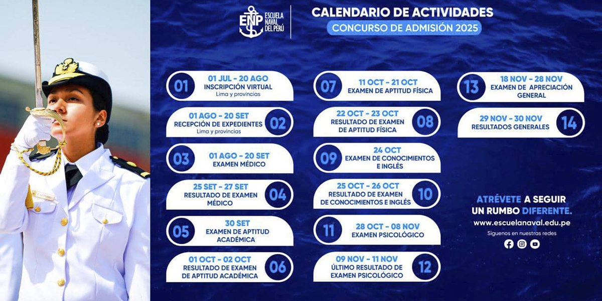 El cronograma de actividades establece que las inscripciones virtuales estarán abiertas desde el 1 de julio hasta el 20 de agosto. El examen médico se llevará a cabo hasta el 20 de septiembre, seguido del examen de aptitud académica en las fechas establecidas por la Marina de Guerra del Perú. Además, habrá un módulo informativo en el Open Plaza disponible las 24 horas, donde se podrá obtener información sobre los requisitos, la guía del postulante y el prospecto de admisión.