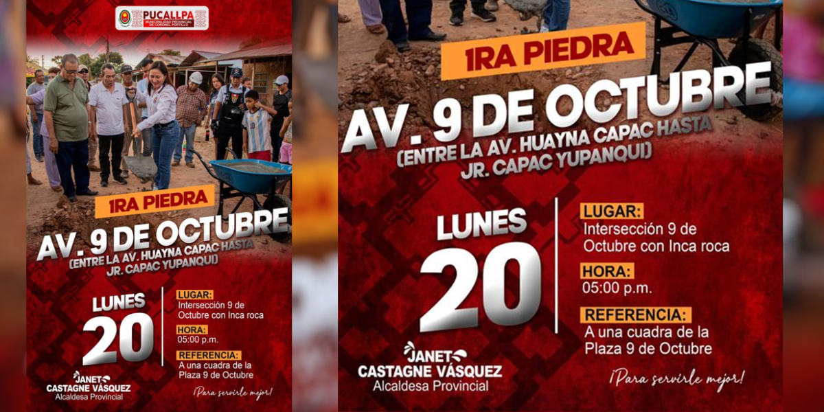 Para hoy día está programada la colocación de la primera piedra de la pavimentación de la ampliación de la avenida 9 de octubre que abarcará entre los jirones Huayna Cápac y Cápac Yupanqui, en el tradicional AH 9 de octubre.