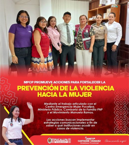 La alcaldesa de Coronel Portillo, Janet Castagne Vásquez, viene implementando una estrategia comunicacional para prevenir la violencia contra la mujer y el entorno familiar, a fin de que se adopten acciones preventivas, evitando tragedias.