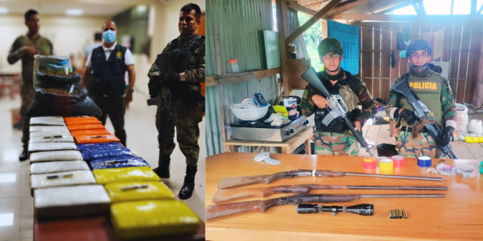 Tras un vuelo de aproximadamente 50 minutos, las unidades policiales detectaron una plantación de hoja de coca de aproximadamente dos hectáreas. A las 9:40 de la mañana, se encontraron dos estructuras rústicas que contenían tres escopetas de caza sin número de serie ni marca, 21 paquetes rectangulares de cannabis sativa, 620 kilos de ácido clorhídrico, mil 980 kilos de acetona y diversos utensilios para la elaboración de drogas.