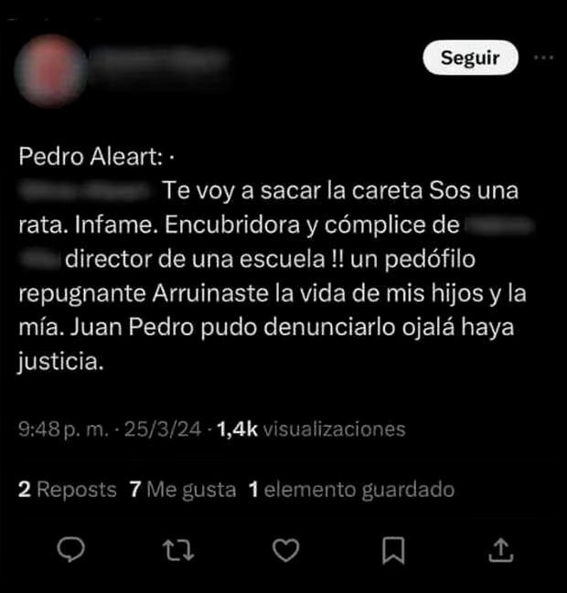 “Te voy a sacar la careta. Eres una rata infame y encubridora. Encubridora y cómplice de un director de escuela. Un pedófilo repugnante¤, escribió. “Arruinaste la vida mía y la de mis hijos. Juan Pedro pudo denunciarlo ojalá haya justicia”, agregó.