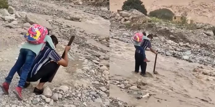 Pero incluso este desafío adicional no los detiene. El profesor Julio, con un palo de madera como apoyo, carga a Valentina en su espalda, asegurándose de que ambos lleguen a la escuela a tiempo.