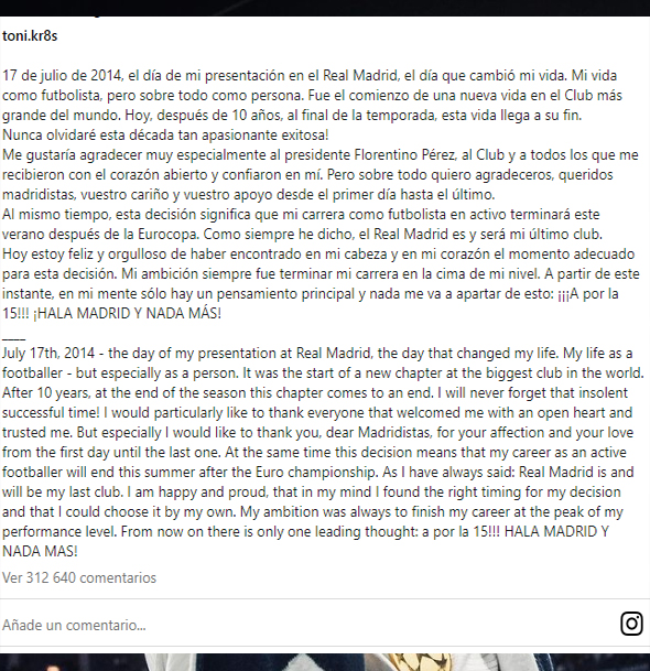 Carrera Exitosa: Desde su llegada al Real Madrid en 2014, Kroos ha tenido una carrera impresionante, acumulando 22 títulos en 463 partidos. Sus logros incluyen 4 Copas de Europa, 5 Mundiales de Clubes, 4 Supercopas de Europa, 4 Ligas, 1 Copa del Rey y 4 Supercopas de España. Kroos expresó su gratitud y emoción en un mensaje conmovedor en su cuenta de Instagram: “7 de julio de 2014, el día de mi presentación en el Real Madrid, el día que cambió mi vida. Mi vida como futbolista, pero sobre todo como persona. Fue el comienzo de una nueva vida en el Club más grande del mundo. Hoy, después de 10 años, al final de la temporada, esta vida llega a su fin”.