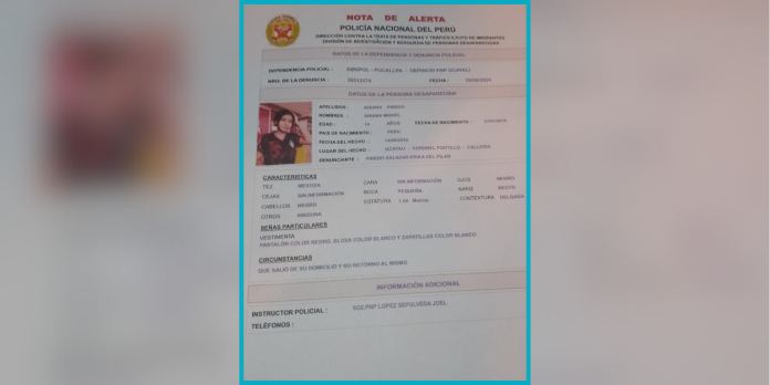 Este jueves 19 de septiembre, se reportó la desaparición de una adolescente con las iniciales A. M. A. P. de 14 años. Su madre, Erika Del Pilar Pinedo, presentó la denuncia tras el inusual comportamiento de Ariana, quien salió de su domicilio y no ha regresado. La fecha de la desaparición es del sábado 14 de septiembre, no obstante, Del Pilar Pinedo, según la Nota de Alerta, recién denunció el jueves 19 de septiembre.