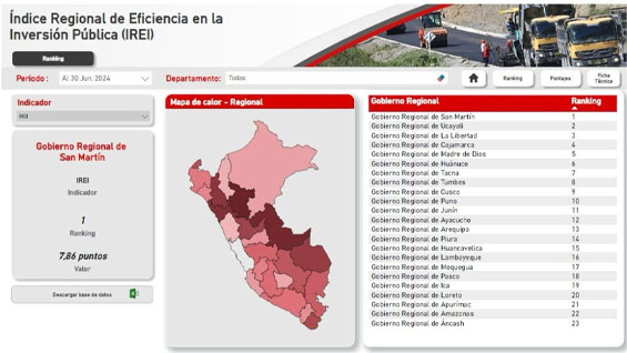 El Gobierno Regional de San Martín (Goresam) se posiciona en el primer lugar a nivel nacional en el prestigioso ranking del “Índice Regional de Eficiencia en la Inversión Pública” (IREI) al cierre del primer semestre de 2024. Esta evaluación, que analiza el desempeño de los gobiernos regionales en la gestión de recursos públicos, destaca a Goresam como un modelo de eficiencia en la utilización de fondos destinados a mejorar la calidad de vida de la población.