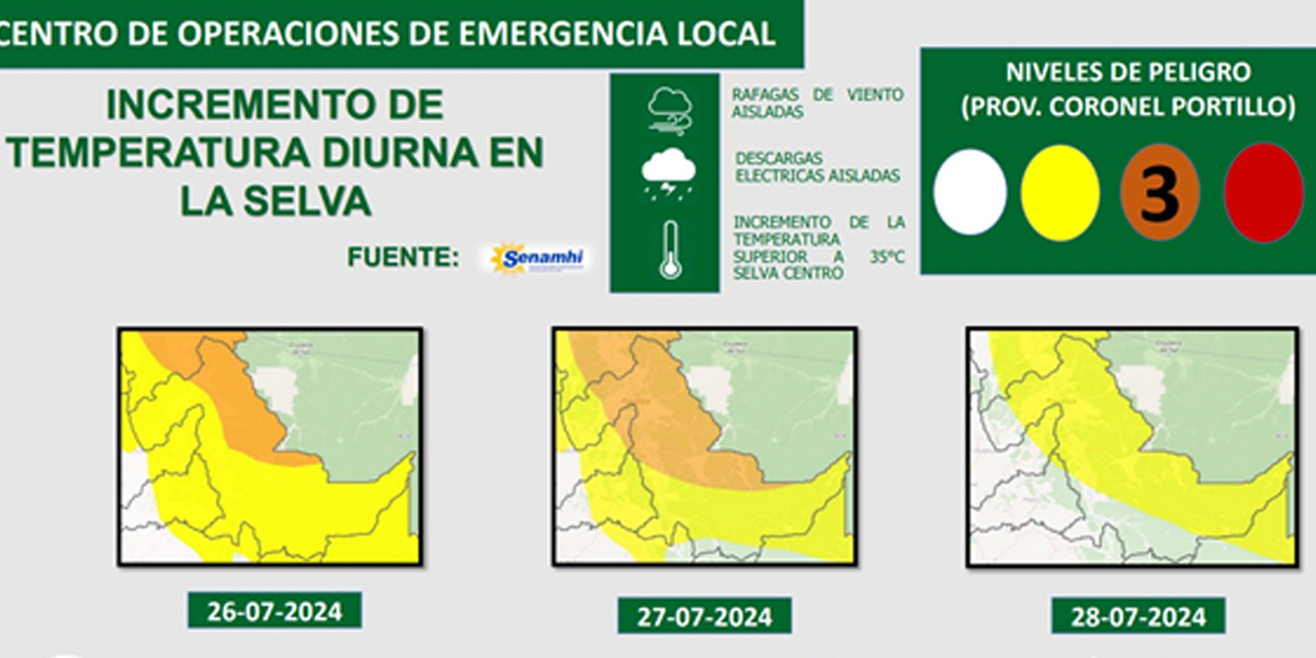 El reciente Aviso Meteorológico 054-2024 del SENAMHI, citado por del Centro de Operaciones de Emergencia Local (COEL) de la municipalidad provincial de Coronel Portillo, advierte sobre el incremento de temperatura diurna en la selva entre el 26 y 28 de julio, superando los 35° C de calor.