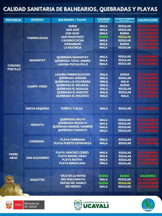Las otras 31 están consideradas como no saludables y, por lo tanto, se recomienda que la población no use sus aguas para bañarse, durante el tradicional San Juan.Diresa Ucayali informa a la población en general el presente informe de la evaluación sanitaria de las playas y balnearios representativos de Coronel Portillo y Padre Abad.