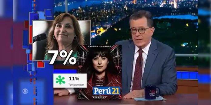 El presentador no escatimó en comparaciones, equiparando la aprobación de Boluarte con la calificación que recibió la película ‘Madame Web’ en el portal de reseñas de cine Rotten Tomatoes. Con un tono humorístico, Colbert señaló que la puntuación de Boluarte es un 4% menor que la de la mencionada película, agregando en tono sarcástico que, según lo que le han dicho, Madame Web ahora es la presidenta de Perú.