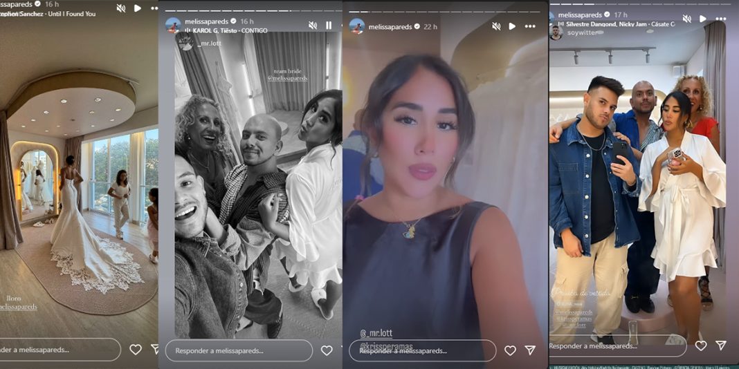 Melissa pasó un buen tiempo probándose diferentes estilos de vestidos de novia. En una imagen, se la ve con un vestido de corte sirena, ajustado al cuerpo y con una larga cola de al menos 2 metros, mientras que en otro diseño se destacaba una textura diferente que daba la ilusión de más volumen, junto con un hermoso drapeado en la parte superior.
